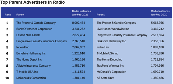 A key advertising theme has emerged in the first two months of 2021: household cleaning supplies. Procter & Gamble was once again the number one parent advertiser on radio, broadcast television and local cable. The consumer packaged goods company aired its most number of spots on television, followed by cable. In addition, it increased instances across all three media. Overall, it aired 25,176,258 spots in January-February 2021, compared to 21,843,748 over the same period last year -- an increase of 15.26%, according to Media Monitors' latest rankings of top advertisers.