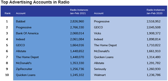 Babbel, the language learning app, pushed out insurance provider Progressive as the number one advertising account in Media Monitors' radio rankings. The company aired 2,826,960 spots, just slightly ahead of the 2,766,330 instances aired by Progressive.