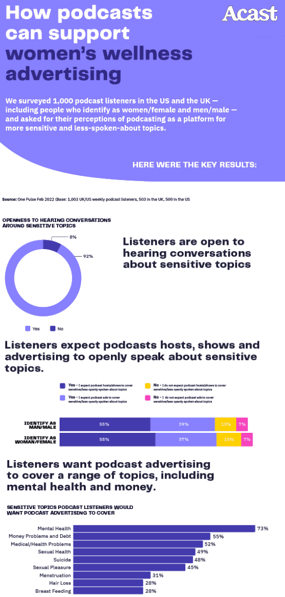 So what about podcasts? According to Acast's research, the podcast environment is a safe place for these important conversations and products that prioritize women's wellness, sexual health, reproduction, etc. Most notably, listeners expect these conversations from the medium, with an overwhelming 92% of podcast listeners saying they're open to hearing such conversations, and 57% saying they fully expect podcast hosts and guests to cover these sorts of subjects.