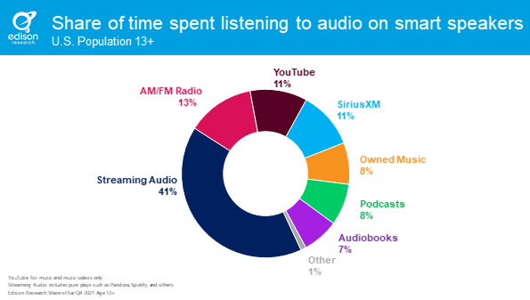 The graphic below from Edison Research's Share of Ear report shows what Americans are listening to on their smart speakers. These devices have made all types of audio content easily accessible in homes.