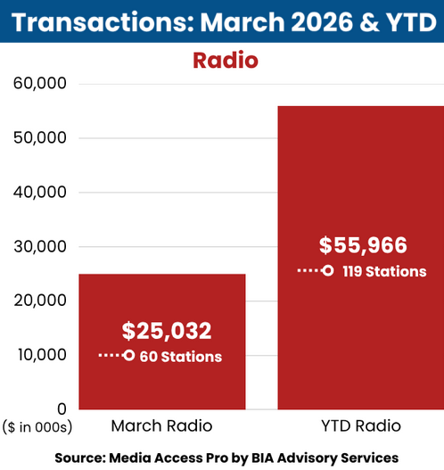According to BIA, radio transactions totaled $25.0 million in March, spanning 60 station sales. Year-to-date, radio deal volume reached $55.9 million across 119 stations, reflecting steady consolidation activity in the industry.