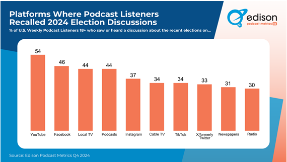 A new study by Edison Podcast Metrics has revealed significant insights into the media habits of weekly podcast listeners, particularly in the context of the 2024 U.S. general elections. According to the findings, YouTube emerged as the top platform where podcast listeners ages 18 and over engaged with political discussions, with a significant 54% share. This places YouTube well ahead of other traditional and digital media platforms.