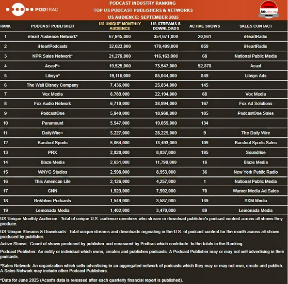 Podtrac has released its September 2025 podcast industry rankings, highlighting audience and download growth across top U.S. shows and publishers.