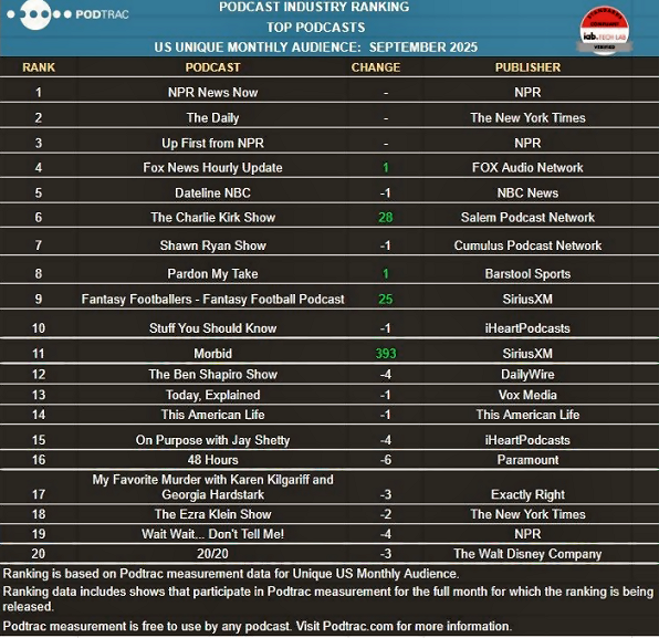 Major movers included The Charlie Kirk Show, which jumped 28 places to No. 6, and Fantasy Footballers - Fantasy Football Podcast, up 25 spots to No. 9. The biggest leap came from Morbid, which surged 393 spots to No. 11, marking a standout rebound for the true-crime series from SiriusXM.