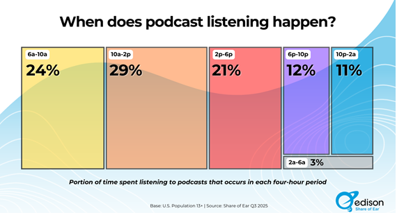 Edison Research has released a preview of new Share of Ear data revealing when Americans spend the most time with podcasts. According to findings from the upcoming Q3 2025 report, Americans age 13 and older now spend 10% of their total daily audio time listening to podcasts.