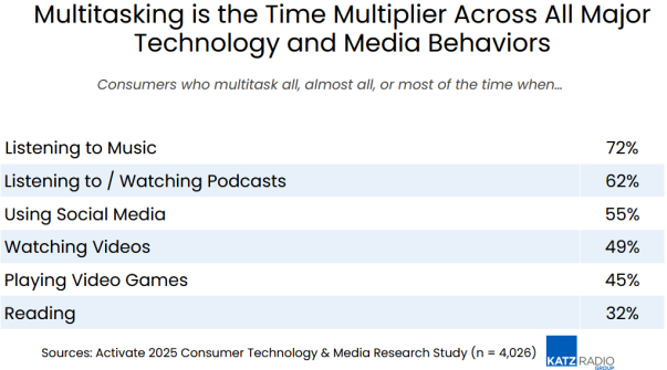 The study finds that when simultaneous activities are accounted for, today's consumer effectively experiences the media equivalent of a 32-hour day. With devices, apps, and screens competing for attention, audio stands apart as the medium that fills the gaps-and often runs underneath-nearly everything else people do.