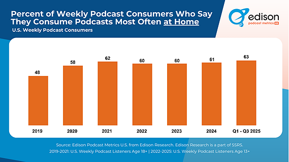 According to the data, 48% of weekly podcast consumers in 2019 said they most often listened to podcasts at home. That figure rose sharply to 58% in 2020 during the height of the pandemic. Rather than declining as restrictions eased, at-home podcast listening has continued to increase, reaching 63% of weekly podcast consumers today.