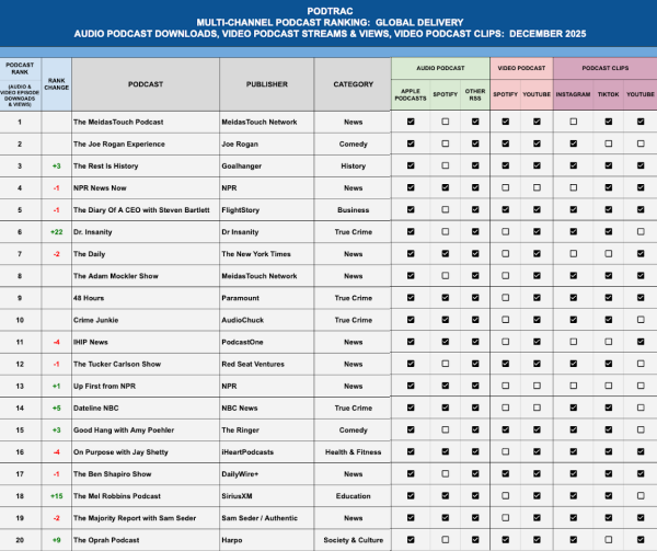 The new Top 200 monthly ranking captures delivery from traditional audio podcast downloads on platforms such as Apple Podcasts and Spotify, full video episodes viewed on YouTube and Spotify, and short-form podcast video clips played on Instagram, TikTok, and YouTube. Every audio and video podcast is eligible for inclusion in the ranking.