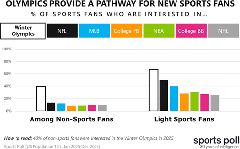 According to the SSRS Sports Poll, the Olympics draw significantly more interest from non-sports fans and light sports fans than other major leagues - a trend that has remained consistent for more than 30 years of tracking.