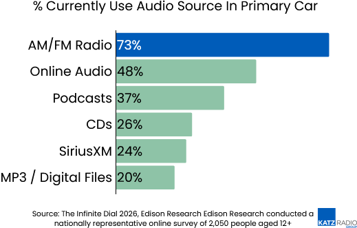 The in-car environment remains a key strength. About 73% of Americans use AM/FM radio in the car, continuing to make it the dominant audio source during commutes and travel.
