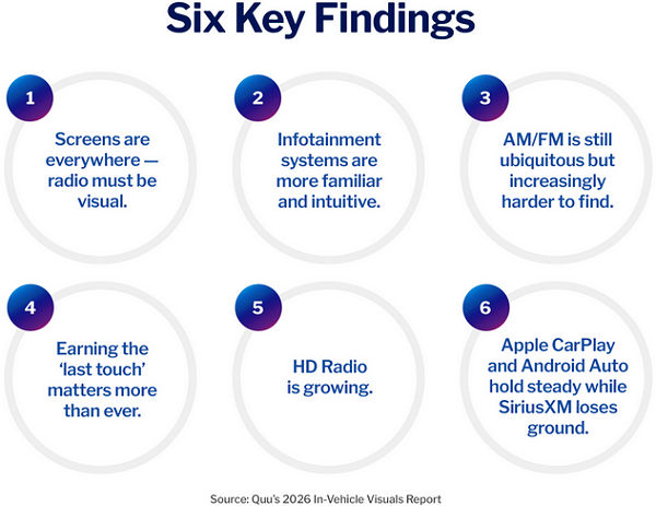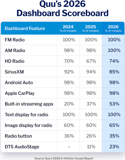 Quu has released its 2026 In-Vehicle Visuals Report, offering a detailed look at how radio is positioned across the top 100 best-selling vehicles in the U.S. The study, now in its third year, highlights both the continued presence of broadcast radio and the growing challenges it faces inside increasingly digital dashboards.