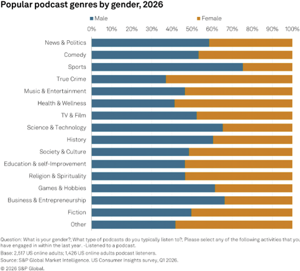 Gender also plays a significant role in content preferences. Sports podcasts skew heavily male, with men making up 75% of listeners, while 63% of true crime podcast listeners are female. News and politics ranks as the most popular category overall, followed by comedy, sports and true crime. Health and wellness content attracts a majority female audience, while business and entrepreneurship programming leans male.