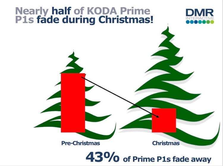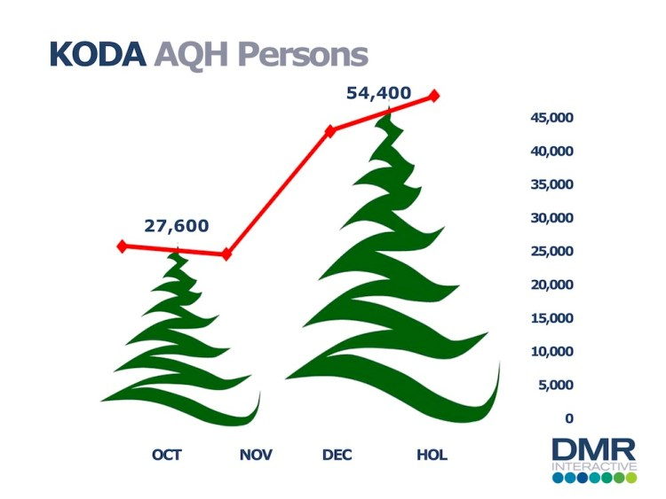 DMR Interactive studied audience trends of stations that convert to all Christmas. The AQH (Average Quarter Hour) increase for KODA/Houston is driven primarily by new listeners finding the station.
