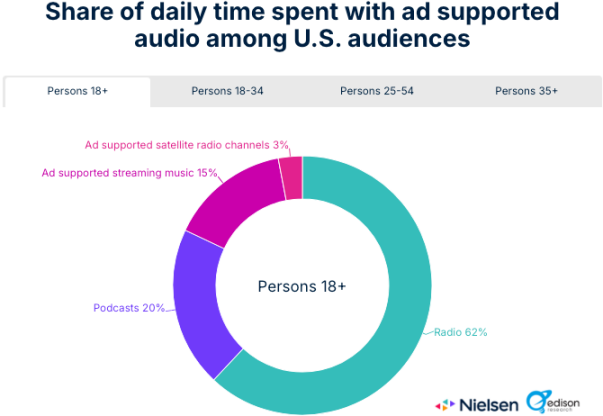 The study, based on Spring 2025 data from Nielsen's National Regional Database, underscores radio's dominance among ad-supported audio platforms. Americans spend 64% of their daily ad-supported listening time with broadcast radio, compared with 19% for podcasts and just 17% combined for streaming and satellite radio.